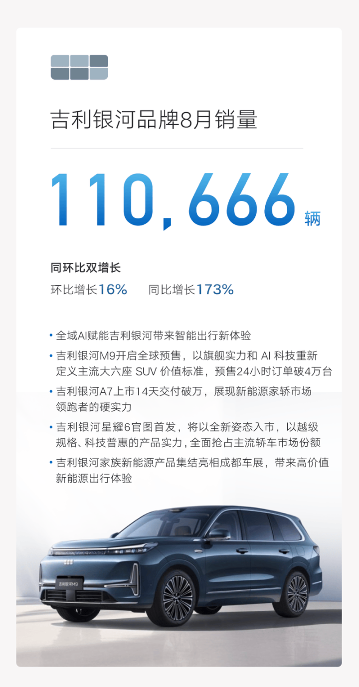 吉利银河品牌8月销量110666辆,环比增长16%,同比增长173%。其中银河M9预售24小时订单破4万辆;银河A7上市14天交付破万。