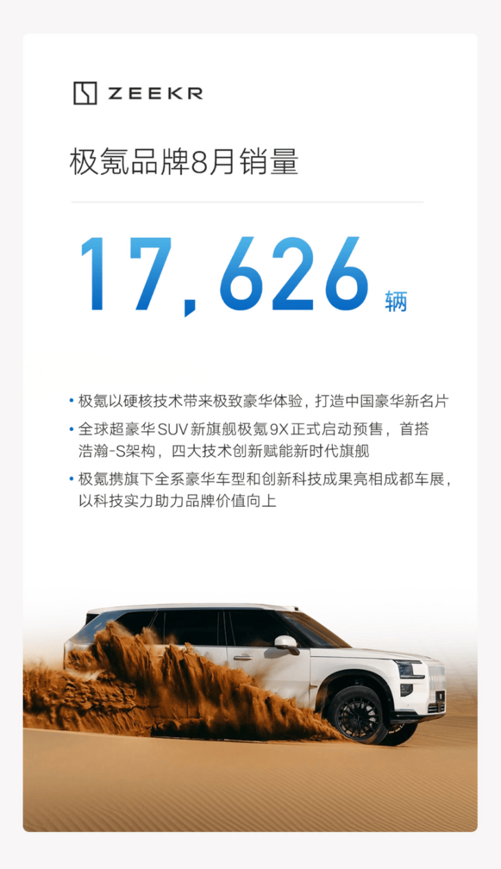 极氪品牌8月销量17626辆。目前,其新旗舰极氪9X正式启动预售,新车首搭浩瀚-S架构,四大技术创新赋能新时代旗舰。