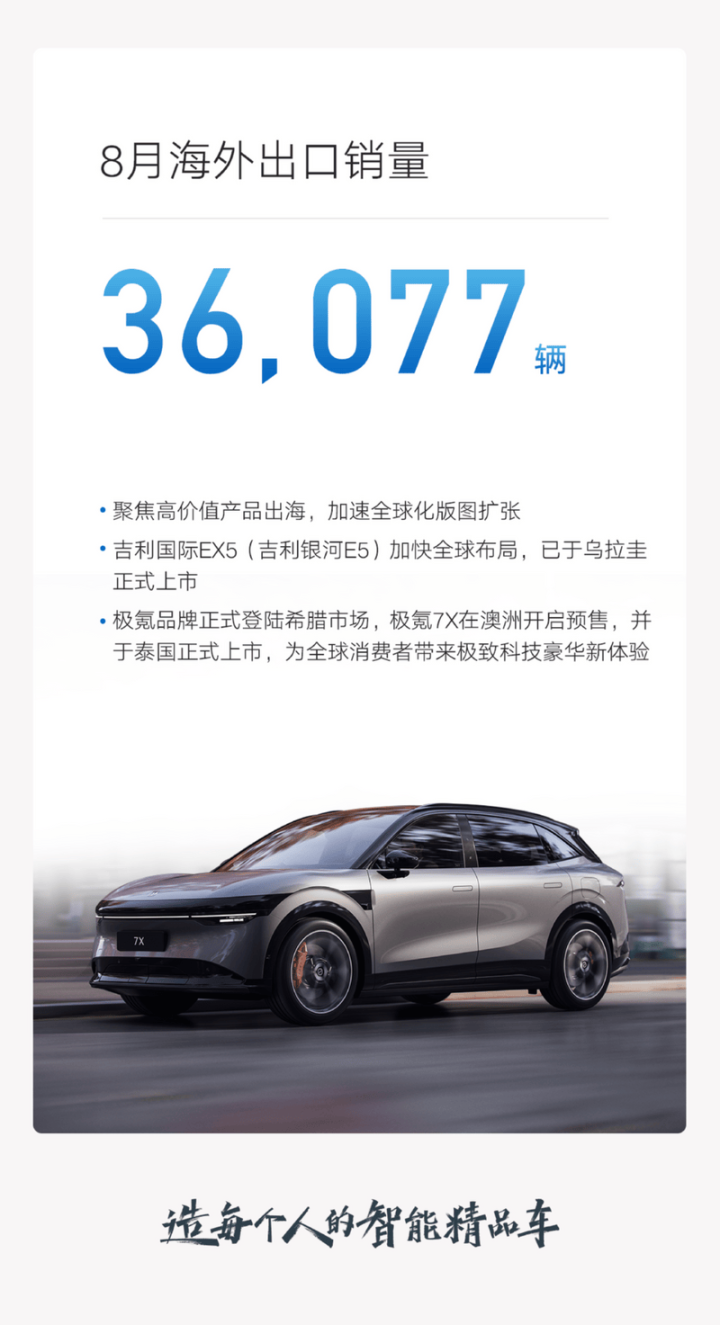 出口方面,吉利汽车8月海外出口销量36077辆。其中,吉利国际EX5(吉利银河E5)加快全球布局,已于乌拉圭正式上市;极氪品牌正式登陆希腊市场,极氪7X在澳洲开启预售,并于泰国正式上市。