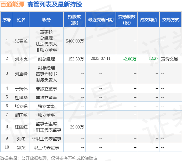 百通能源的高管列表及最新持股情况如下: